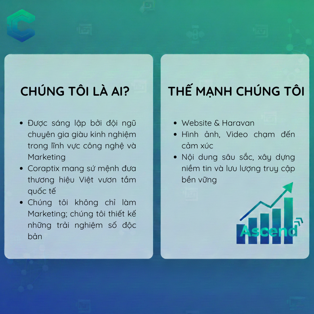 Chúng tôi là ai? Được sáng lập bởi đội ngũ chuyên gia giàu kinh nghiệm trong lĩnh vực công nghệ và marketing, Coraptix mang sứ mệnh đưa thương hiệu Việt vươn tầm quốc tế. Chúng tôi không chỉ làm Marketing; chúng tôi thiết kế những trải nghiệm số độc bản. Thế mạnh của chúng tôi: Lấy Thiết kế Website đẳng cấp làm trọng tâm, Coraptix tạo ra 'vũ trụ' tăng trưởng cho bạn thông qua: Hệ thống Website & Haravan: Chuẩn kỹ thuật, tối ưu vận hành đa kênh. Media & Visual: Hình ảnh và Video chạm đến cảm xúc, dẫn dắt hành vi. SEO Content: Nội dung sâu sắc, xây dựng niềm tin và lưu lượng truy cập bền vững. Tại Coraptix, mỗi dự án là một hành trình Innovate (Đổi mới) để Secure (Vững chãi) và cùng doanh nghiệp Ascend (Thăng tiến). Hãy để chúng tôi cùng bạn viết tiếp chương mới cho sự thành công của thương hiệu!"